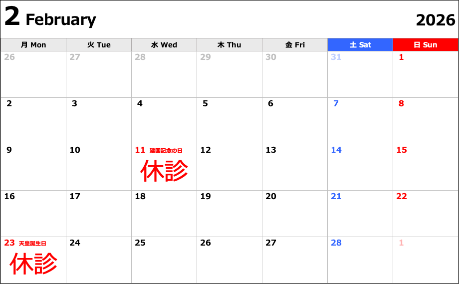 【お知らせ】2月診療カレンダー🗓️ お知らせ X Facebook LINE コピー 2026.01.29※日曜日に休診と記載していませんが全て休診です。ご注意ください。花粉症が強くなってくる季節です。早めの治療で楽に過ごせるようになりますのでお悩みの方はぜひご相談ください。一鍼多幸