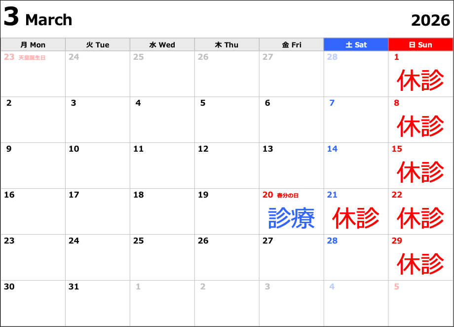 【お知らせ】3月の診療カレンダー🗓️です お知らせ X Facebook LINE コピー 2026.02.273月の診療カレンダー🗓️です。ご予約の際の参考になさってください。花粉症がひどくなる季節です。鍼灸治療では治すことが可能です。ぜひお早めにご相談くださいね✨一鍼多幸