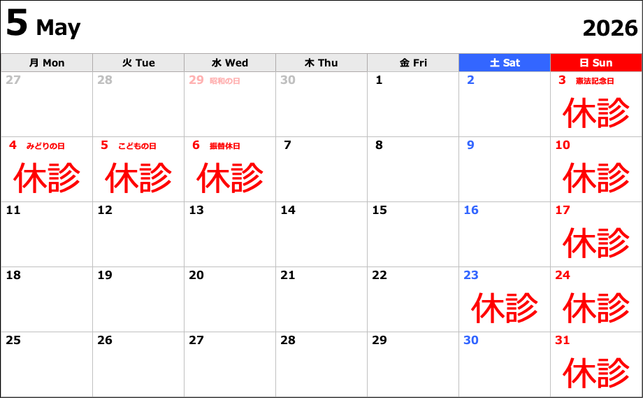 【お知らせ】5月の診療カレンダー🗓️ お知らせ Facebook LINE 2026.04.24 今年の5月は数年ぶりにゴールデンウィークに丸々お休みをいただきます。 患者様にはご不便をおかけいたしますがお問い合わせ等お間違えないようご注意ください。 またこの時期はやる気が出なかったり活力が低下しやすい時期でもあります。 少し変だなとか調子が上がらないなど違和感を感じた際は、なるべく早くご相談いただきしっかりケアをしていきましょう。 皆様のご相談、心よりお待ちしております。 一鍼多幸